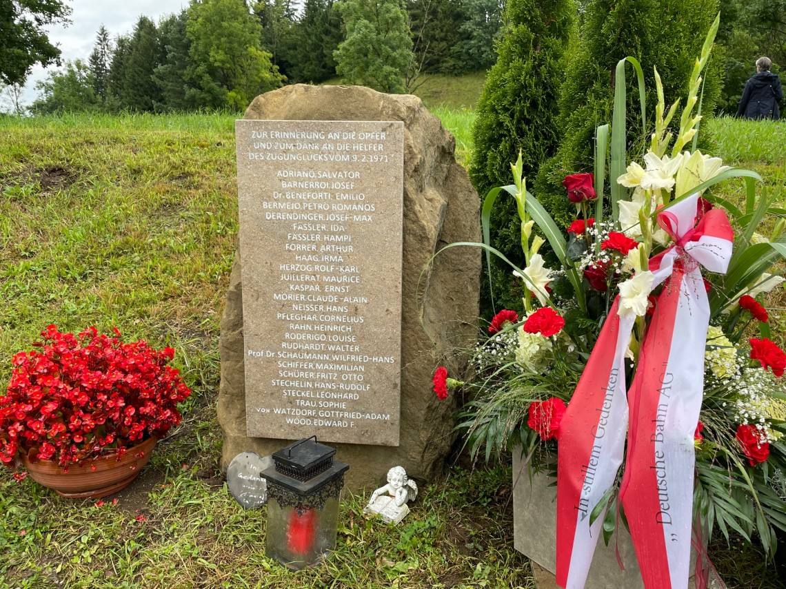 Bernhard Blaas konnte als Vertreter der Deutschen Bahn die neue Gedenkstätte übergeben. Auf einem Gedenkstein stehen die Namen der beim Unglück Verstorbenen und eine Info-Tafel erläutert die Abläufe der Unglücksnacht. In seiner Ansprache entschuldigte sich Herr Blaas bei den Angehörigen der Opfer für das Versagen der Sicherheitssysteme der Bahn und erläuterte die laufenden Entwicklungen bei Technik und Ausbildung. Pfarrer Paratiyil Jinesh sprach über die Bedeutung eines Denkmals und spendete den kirchlichen Segen.